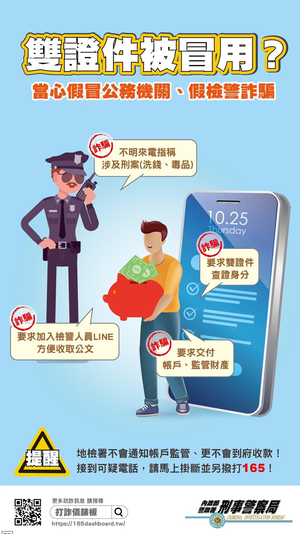 刑事局提醒,警方不會用通訊媒體視訊製做筆錄、法院不會通知監管帳戶,只要聽到關鍵字「證件遭冒用」、「偵查不公開」、「帳戶涉洗錢或其他不法」、「加LINE定時回報」、「監管帳戶」、「繳交公證金」,或者在電話中要協助「轉接165專線、轉接銀行專員、轉接地檢署或法院」等,舉凡來電「要核對身分」就是詐騙,切勿上當。