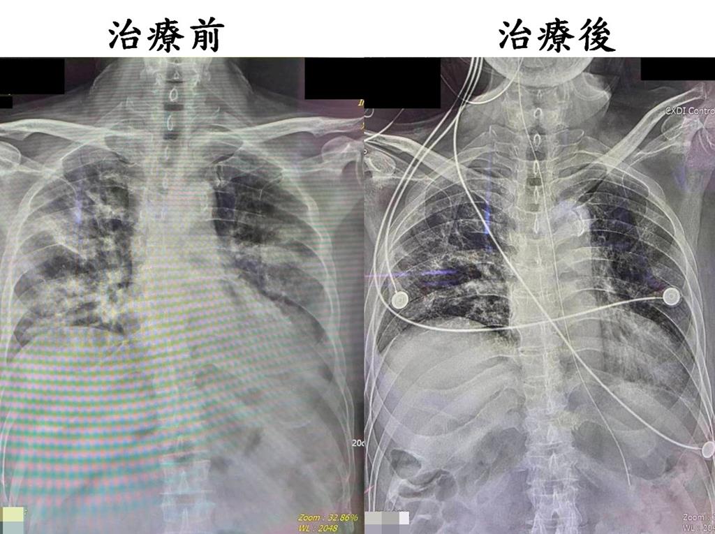 病人到院時兩側肺部呈現發白狀態(左圖),經團隊治療後順利改善(右圖)。(大千綜合醫院提供/呂麗甄苗栗傳真)