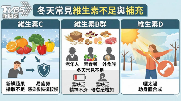 成大醫院家庭醫學部醫師 丁子茵表示,維生素C來自新鮮蔬果,冬天蔬果吃得比較少時,容易攝取不足,可能讓人容易疲勞、感染後恢復較慢。另外,維生素B群也是冬天常見的不足項目。老年人、素食者、外食族特別容易缺乏,可能導致精神不濟、倦怠感增加。補充的方式包括曬太陽,日照能幫助身體合成維生素D。
