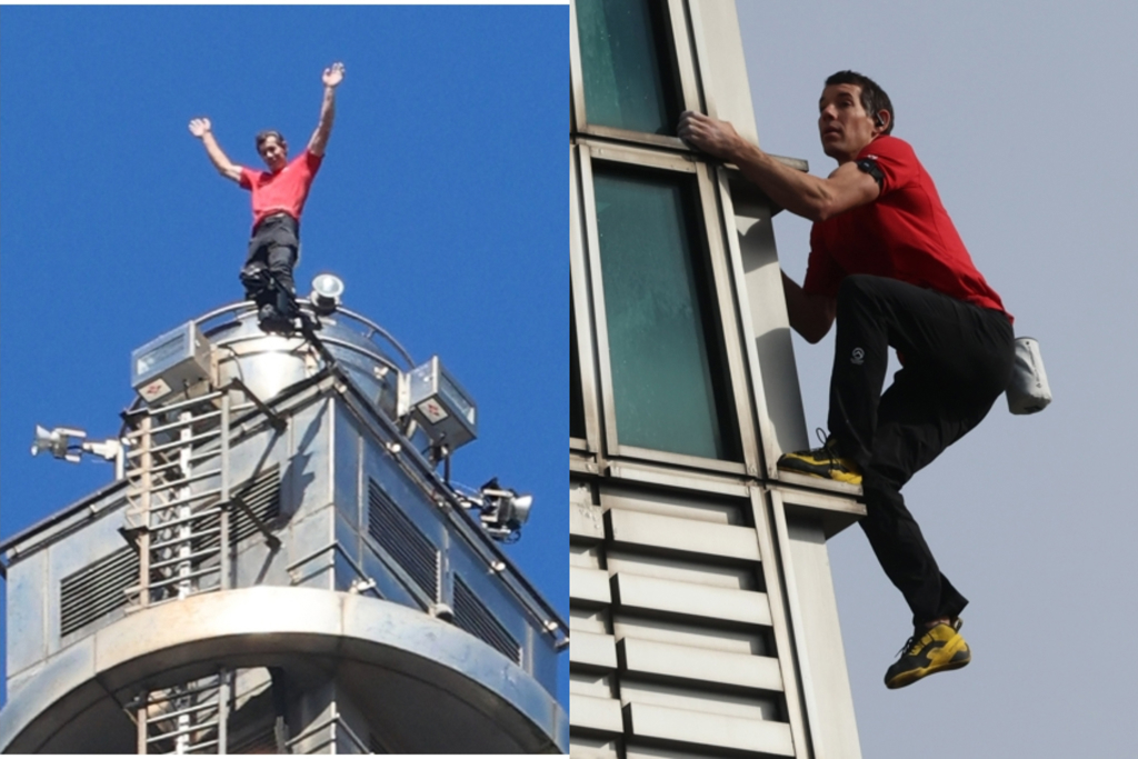 美國攀岩家Alex Honnold昨完成徒手登上台北101大樓的壯舉。(圖/黃世騏攝)