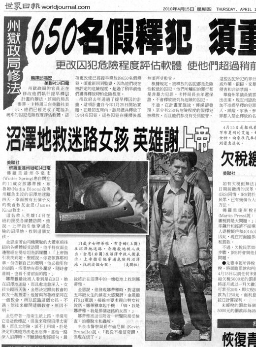 (April 15, 2010 美聯社佛羅里達州坦帕14日電)佛羅里達州冬泉市(Winter Spring)患自閉症的11歲女孩娜蒂雅‧布魯姆(Nadia Bloom)在佛州鱷魚出沒的沼澤地迷路四天,幸而被有五個子女的教會教友金恩(James King)救出。這名救人英雄14日在紐約接受各媒體訪問,他說,上帝指引他穿過危險的沼澤地,找到這個女孩。