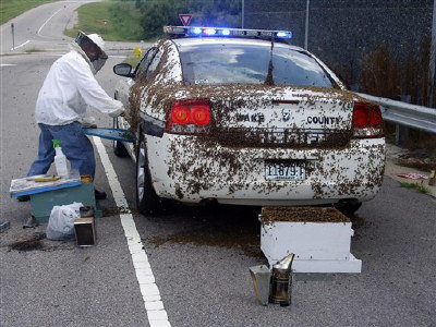 然而,August 17, 2010,這一天,一輛警車失去平時的威風,反而被一大群蜜蜂盯上給教訓了一頓! 北卡州洛麗一名威克郡警員所開的警車被大群蜜蜂包圍,使他動彈不得,不得不出動專家來解圍。