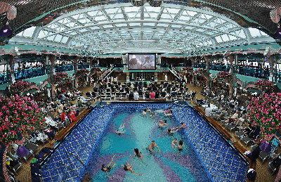 長952呎的「嘉年華光輝號」遊輪內部設備豪華,但因失火失去電力,現在遊客無空調、熱水或電話可用。(美聯社)