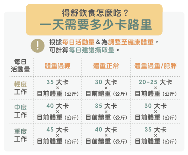 【重點】這種飲食法不在於教導人該『禁食』什麼,而是『進食』什麼。首先計算自己一天需要多少的卡路里!參考下圖標準: