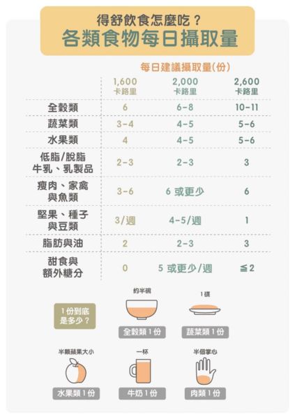 1.所謂的一份,全穀類約是半碗,蔬菜是一碟,半顆富士蘋果大小的水果,一杯牛奶,以及半個手掌心大小的肉類。