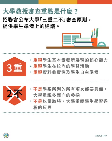 第二是重視學生在校內的學習活動,大學審查重心是以高中校內的學習活動為主,因此準備備審資料應以校內學習成果為核心。