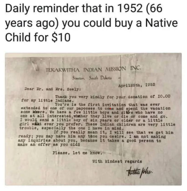 查明事實真相至關重要,因為FBI統計數據顯示,這些人每年至少折磨致死至少4萬名美國兒童,更不用說那些從海外走私來的。正如這封1953年提供以10美元出售每名美洲原住民兒童的信所示,這種情況並非新鮮事。