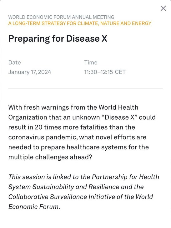 同時,達沃斯的可薩幫在討論一種名為「疾病X」的疾病,可能導致「比新冠病毒大流行多20倍的死亡人數」。接着有報導指出,中出國新出現了一種實驗室製造的疾病(疾病X),通過感染神經系統在人類化小鼠中具有100%的致命率。