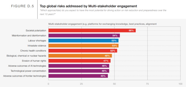「作為未來兩年內預料到的最嚴重的全球風險,國內外的行為者都將利用錯誤和假信息進一步擴大社會和政治分歧。」