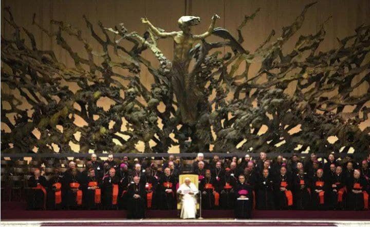 This is how I became directly involved in a massive war that has literally been raging for thousands of years. The Satanists I met told me they had arrived on this planet 26,000 years ago to seize control of human destiny. These are the fallen angels of Biblical lore. They ride humans the way we ride bicycles. Just like we keep buying new computers and downloading our software into them, they ride humans from generation to generation, downloading their group think into their minds. They are parasitical in nature and need to murder and plunder in order to stay alive. As an illustration, take a look at what is behind the fake Pope Francis in the pictures below. This is what we are fighting against.