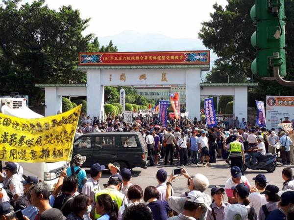 蔡英文6月30日抵達復興崗時,竟被抗議團體阻擋車隊。現場警力超過五比一,五個人防備一個抗議者理當綽綽有餘,卻還是讓蔡英文的車隊遭受到阻撓,在蔡要離開會場時,還派出警察以及特勤形成「人龍」把車隊兩邊圍住,這是罕見的高強度維安狀況。為何警力陣仗這麼大卻無法阻擋人數不多的抗議者?因為這次抗爭團體,許多都是退休軍警,現職執勤的員警看到學長不免客氣三分,連要排除他們,也是客氣的請他們走。