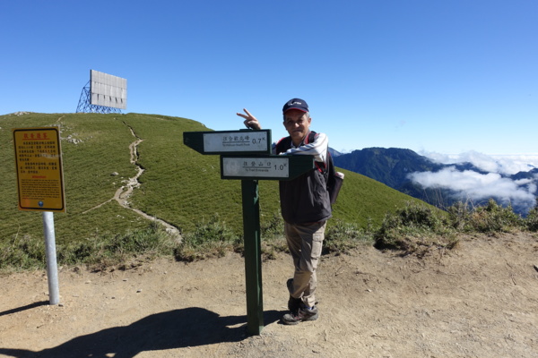 接近山頂的稜線上,豎立了一座巨型的反射板,是合歡北峰最明顯的標誌,看了手錶已是九點三十分了。之後視野愈來愈開闊,可以欣賞到在山谷翻滾的雲海。雖路已稍平坦,不過空氣稀薄,還是讓人走起來氣喘如牛。