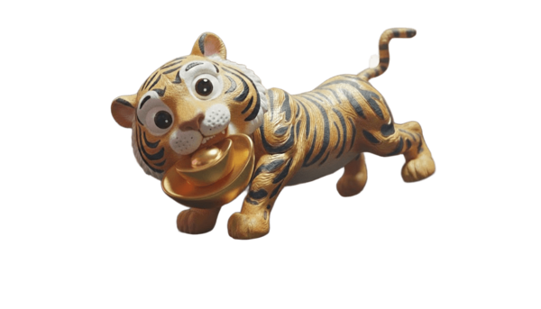 崙仔平福德祠的虎爺,刺青紋身在傳統文化中象徵守護、財運與鎮宅,Q版虎爺呈現出奔跑或坐的姿態,俏皮破百。牠是福德祠伯公仔的座騎,有咬錢招財與守護孩童功能,牠和Q版福德老爺造型,都有一對大大的眼睛,親合力十足,嘴裡咬著元寶的視覺元素,和Q版福德老爺形成了「雙倍財氣」的意象。