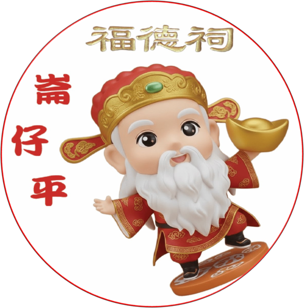 福德老爺化身為超萌守護神,以大眼睛、圓臉龐的Q版造型呈現。祂手持金元寶把財氣與福氣帶進家門,腳踏四方孔錢從雲端而來,用外圓內方傳遞出一種「財富與好運就在身邊」的親近感,拉近了人與神之間的距離。