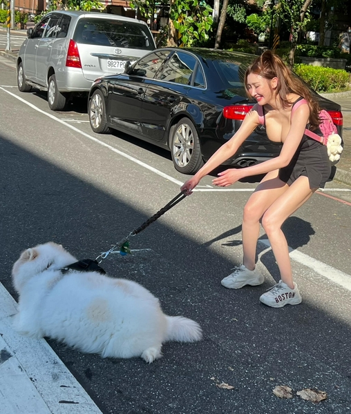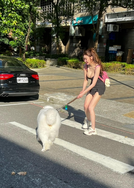 中和長腿巨乳妹斑馬線上遛狗!使出吃奶力氣狗不動,胸前狂抖,加賴88WET直接約她回家遛你!