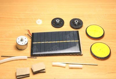 製作太陽能電動車需要材料:瓦楞紙板、太陽能板、美工刀、模型車輪、馬達、廢吸管、齒輪、熱熔膠槍、鉛筆、電線、電烙鐵。