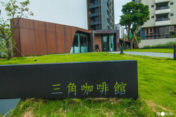 【三角咖啡館】,三角型的內外空間設計,外觀搭配大片的綠色草皮與圓形水池,路過就很吸睛。