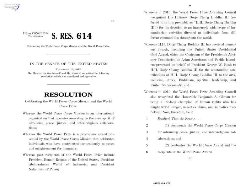 這個參議院的決議文用“H.H.” 來冠名尊稱南無第三世多杰羌佛。這說明了美國國會對南無第三世多杰羌佛至高無上之地位的尊崇。同時這份參議院的決議記錄也明示了美國國會認可世界和平獎評獎委員會是一個崇高、榮譽的國際組織。