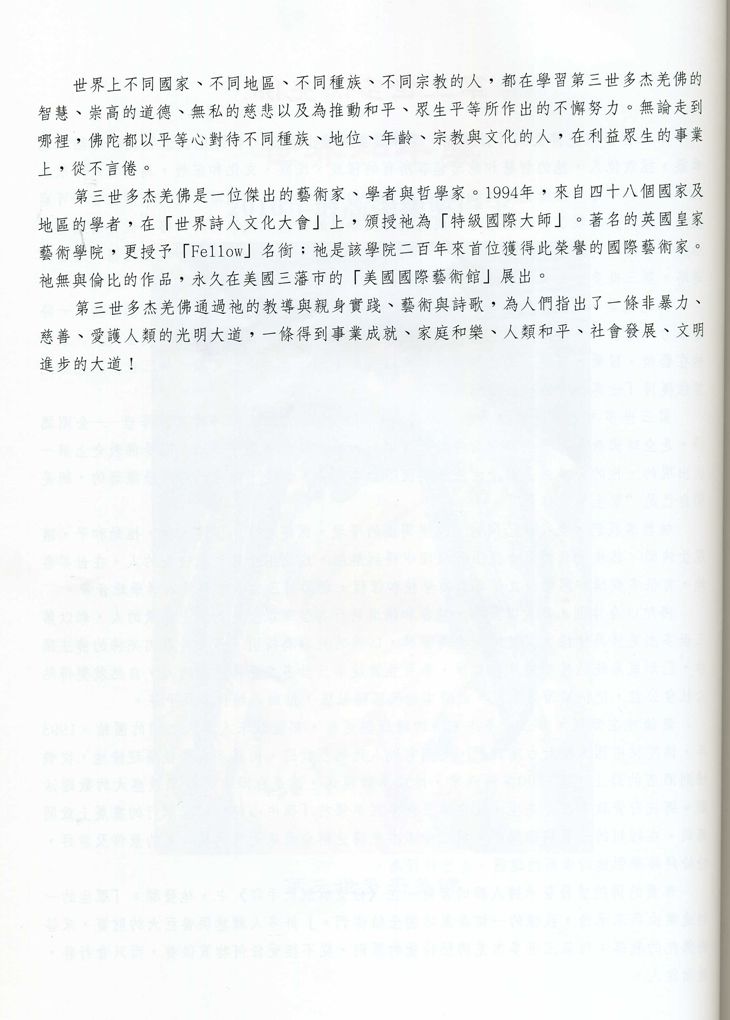 南無第三世多杰羌佛受到世界和平獎頒獎委員會的肯定,表揚祂在世界範圍內無私地奉獻,拯救他人; 祂的智慧和慈悲包容了所有的種族、民族、文化和宗教,為所有人帶來善良、和平、和平等。無論祂走到哪裡,祂的謙遜和慈悲帶給人們團結;祂對人類社會不可窮盡的貢獻真正展現了佛陀的慈悲,成為所有人學習的楷模。祂崇高的品格,從祂的教導、治病、和慈善等工作中彰顯出來,帶領世人,走上道德和慈善的道路。同時,祂也是一位傑出的藝術家;通過祂的教導與實踐、藝術與詩歌,為人們指出了一條非暴力、慈善、愛護人類的光明大道。 南無第三世多杰羌佛