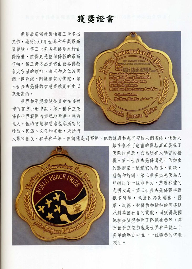世界和平獎於2011年頒發最高榮譽獎給南無第三世多杰羌佛!