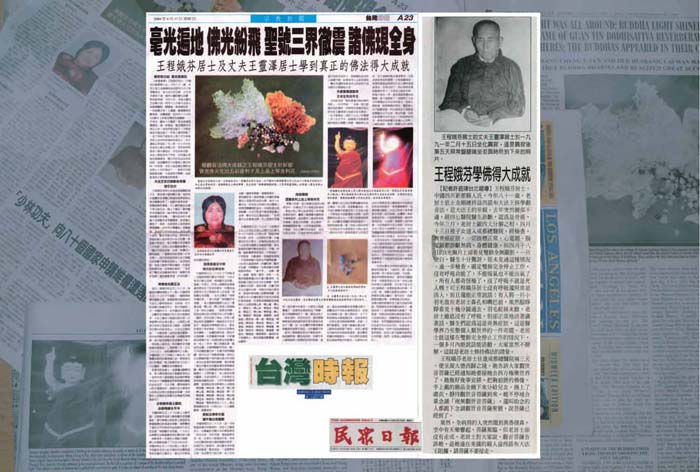王程娥芬居士及丈夫王靈澤居士學到真正的佛法得大成就 王程娥芬居士,中國四川新都縣人氏,今年八十一歲,老居士依止金剛總持益西諾布大法王(即南無第三世多杰羌佛。下同)修學觀音法,是大法王的至親。去年突然腰部不適,經四七醫院醫生診斷,認為是骨癌,今年三月,老居士顯四大分解之相,四月十三日被子女送入成都總醫院,經檢查,無骨癌症狀,一切指標正常,心電圖、腦電圖都診斷無病,身體健康。但四月十八日的X光胸片上卻看見雙肺全無顯影,一片空白,醫生十分驚訝,從未見過這種情況。進一步檢查,確定雙肺完全停止工作,沒有呼吸功能了,不能吸氣也不能出氣了。所有人都奇怪極了,沒了呼吸不就是死人嗎?可王程娥芬居士沒有呼吸還照常是活人,而且還能正常說話!有人將一片小羽毛放在老居士鼻孔和嘴巴前,果然眼睜睜看見十幾分鐘過去,羽毛紋絲未動,老居士徹底沒有了呼吸,但卻還正常地活著講著話。醫生們認為這是奇異症狀,這是醫學界乃至整個人類世界的一件奇聞。老居士就這樣在雙肺完全停止工作的情況下,一個多月內能說話能活動。大家當然不瞭解,這就是老居士修持佛法的證量。