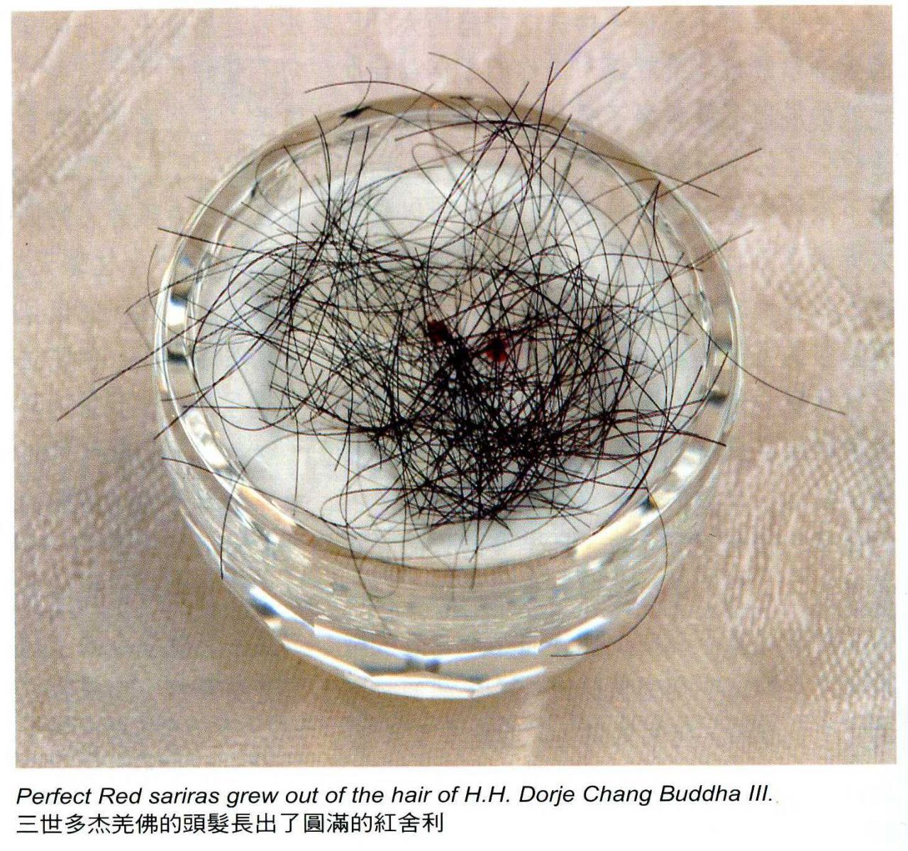 還記得是在2003年6月1日這一天,我將一些尚未打開的紙包拿出來整理,想將頭髮洗一洗,因為頭髮很細,我特別用過濾網裝起,浸在水裏,就看到有三顆圓潤的紅色小珠子在其間,因所有過程是我自己經手,沒有碰觸過任何其他物件,我深感奇怪,哪裡跑來的紅珠子?想用手指按按看,這小珠子是軟的還是硬的?還拿了一個放大鏡仔細來瞧瞧,忽然腦中一念,這會不會是舍利?我這樣做就太不恭敬了!趕緊將那三顆小珠子,裝在一個白色的小盒子內,拿去請示三世多杰羌佛:「請問這是什麼東西?」佛陀上師說:「妳從哪裡得來的?這個是舍利啊!」然後修法持咒,確定這是真正的舍利,我稟告佛陀上師,這是包在紙內,佛陀上師剪下的頭髮中出現的,之後,佛陀上師特別開示:「這應該說是眾生的福報和因緣,無論是怎麼來的,或是佛菩薩加持的也好,同學們怎麼想其實都不重要,它會無中生有來,就會無中生有去,重要的是我們每一個人自我的修行問題,要依教合法。」當晚,我小心翼翼地將這三顆紅色的舍利,裝在一個蓋的很緊密的西藏小盒內,上面墊了一些白棉花。第二天,有位同學想請去看看,我想把舍利換裝在一個新買的水晶瓶內,當我打開小盒子一看,怎麼只有兩顆呢?我沒有再觸碰過任何其他物件啊!棉花被我一絲絲地撕開、撕爛,就是只看到兩顆,真令人懊惱!它印證了三世多杰羌佛先前所言:「它會無中生有而來,無中生有而去!」我也曾聽過一位師姐親見過佛陀上師的身上掉下舍利,這次自己能夠親眼見到,真是無限殊勝祥瑞。以上所說,如有任何假話,願遭一切惡報,確是真實不虛,願眾生得聞多杰羌佛第三世雲高益西諾布頂聖如來的法義,了脫生死,福慧增長。