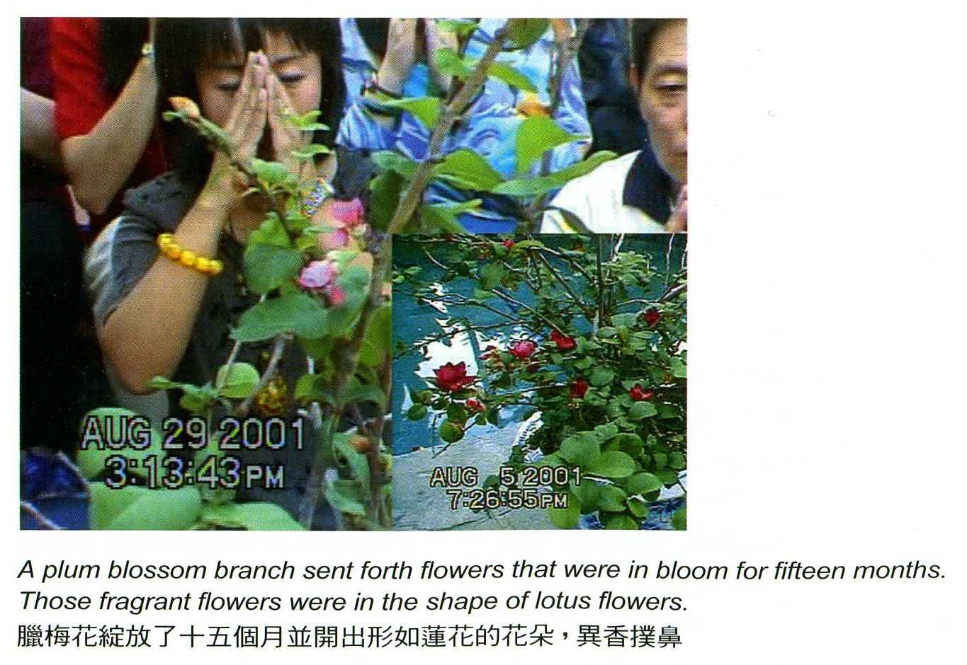 就在圓滿法義開示後,供在法台前的一盆臘月梅花,竟然長出花苞,因為當天是2001年的8月4日,正是暑夏,臘梅剎那綻放了紅色的梅花,說起這一盆臘梅,還是在2000年臘月,我買來供養偉大的佛陀恩師三世多杰羌佛,當時是開著紅色及白色的梅花,大約一個月後,花就全部凋謝了,後來長出新葉,但一直沒有再開過花。