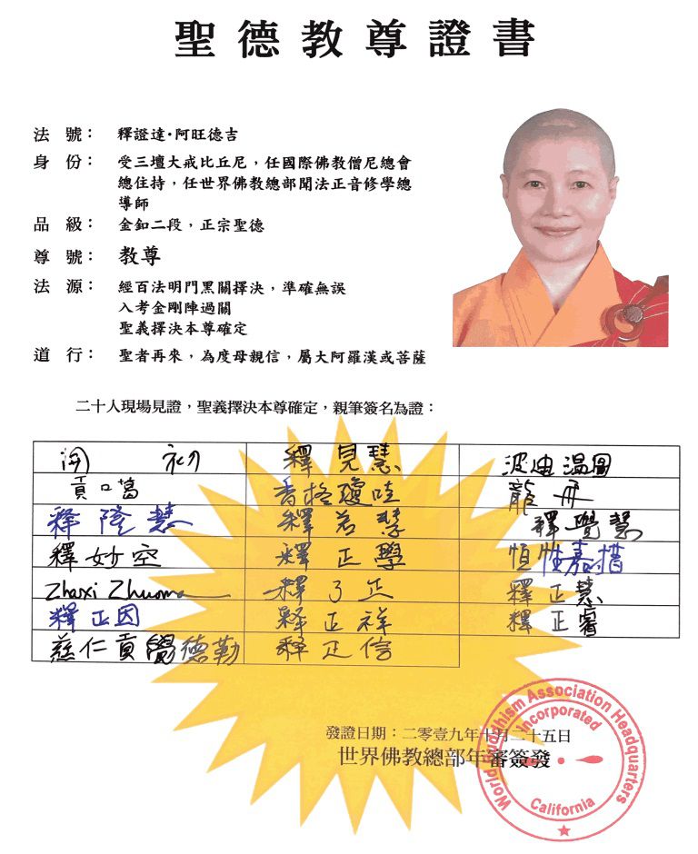 再者,更重要的是,每一個聖證書上都有七師十證共十七位出家人獨立地發了誓、簽了字的,這十七位中必須有三位監考師屬於聖德身份,這十七位與在場的公眾必須在現場親身經歷、親自監考應試之當事人、親眼見識持證者的實際聖量功夫的展顯,這就非同小可了,要拿真本事來認的,而且,這些聖德和出家人會在現場修法對治應考者,比如唸金剛經、大悲咒、楞嚴咒、妙法蓮花經、麻哈嘎拉、大威德金剛、時輪金剛、獨髪母金剛、熱乎拉金剛護法等,如果這位應試者是外道,自然在正法前倒斃,無能為力,如果應試者是正法,但道行不夠程度,沒有考試過關,是沒有任何一位監考師敢拿自己墮地獄作擔保來發誓、在聖證書上簽字的,而且必須是十七個人都簽了字、發了誓,少一個都不行,大家可想而知,這是造不了假的,所以,過關了就是過關了,沒有過關就是沒有過關,過關一星輪級絕不能寫二星輪級,過關二星輪級絕不能寫三星輪級,須彌輪的聖德證書絕不能說是掛有日月輪的聖德師資證書。用一句極其通俗的話說,這絕對是一就是一,二就是二,沒有任何虛假,沒有任何方便!有假就沒有人敢發重誓來簽字!無論一個大德是什麼祖師、尊者、法王、仁波且、法師,也無論他是什麼身份再來的,只有在公眾面前拿出自己的道行來考試,經過七師十證在聖證書上發誓簽字,才能說明是聖是凡、是幾星輪級的道行,是聖德還是聖德師資,這是任何人都做不了假的,因此,這個聖證書是整個佛教界最紮實、毫無水分的、真真實實的證明持證者是具有超凡入聖的聖量而獲得的聖證書!