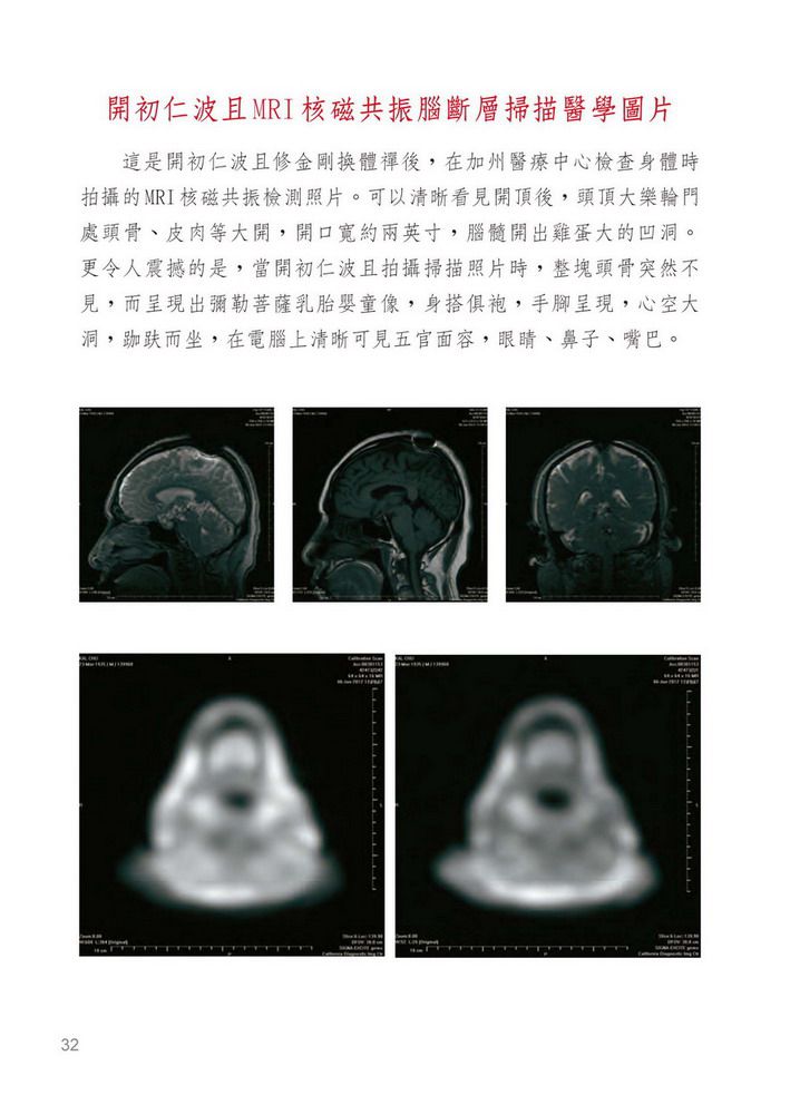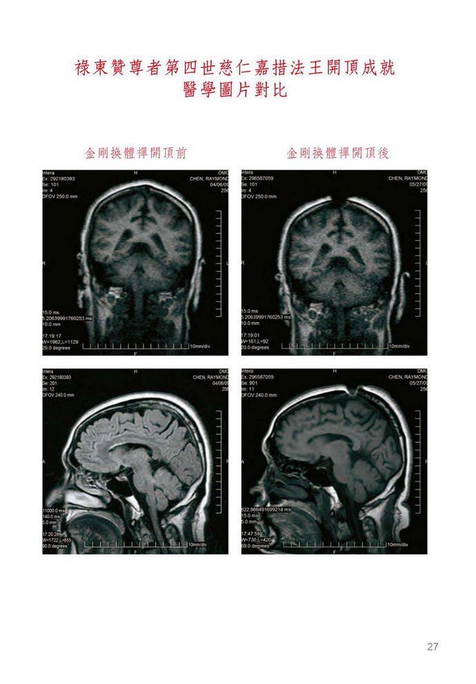 今天既然說到開頂的事也明告世上修行之人,你千萬不要相信插上吉祥草這就是證聖的境界啦,真正證聖不是凡夫的事,首先看一下那自吹開頂的人他真的開頂了嗎?有證據嗎?這可不是插上一支吉祥草或用脫髮水脫掉一縷頭髮就證明開了頂的,你們要弄清楚,那吉祥草硬如竹籤,哪一個人的頭皮都能隨處插上。哪怕吃下幾粒具生命力能在弟子自己手中活躍的金剛丸,這頂也開不了的,那一定要服上一口真正的佛降甘露作為法緣基礎,而且要灌金剛換體禪的境行之頂才能打開大樂頂門,這非同小可,正如妙空法師體悟說:「驚天動地啊!」真正開頂可不這麼簡單啊!學佛人要知道,但凡學佛成就或往升者必須要開了頂才行,而且任何佛法只要修成就,就會開頂,但都是中陰身成就的,如果頂都沒有開,神識又從什麼地方出沒肉體呢?只能由六道轉輪處出走神識,其實不具《解脫大手印》灌頂境行的人是不行的,就是破阿法開了頂,最多也只有一毫米寬,而且神識一當出體後就回不去了,所以只能中陰往升淨土,亦稱為中陰身最好的救度法。只要是受了《解脫大手印》勝義內密灌頂境行法,其功德力大於常規佛法萬倍之多,神識出體後又能返回,十分自由,這功力之強大,不是一句空話,而是實語、如語、無妄語。比如能讓受灌者在一個時辰之內證到虹身境界,但是修大圓滿需經十二年之久,乃達成就者少之;又如金剛換體禪,也是只需一個時辰開大樂輪門之頂,用以現代科學檢視證實頭頂開一指到二指寬的空口不等,乃至其洞深入腦底,達透五輪,神識出入自由,這在常規佛法是沒有的功德道力。要注意的是已經修《解脫大手印》的人,你除了只能加修護法之外,其他任何佛法皆不可以混入修持;但是凡沒有領受到境行修持的人,可以只修《解脫大手印》前行和正行,也可以不修「福壽財富成就法」而加入你曾經修過的本尊正行,溶入在《解脫大手印》前行、正行中修持。但切記不可以與你原有的前行混修,如果你認為法本太長,你可只選《解脫大手印》前行、正行加入你原有的本尊心咒和形相觀修就很圓滿了,只要是加入《解脫大手印》前行、正行、結行而修,就這麼簡單的修持,其功德力也是比常規佛法的成就要大十幾倍的。比如開頂成就解脫就是鐵證,我看到開初仁波且和妙空法師是真開了頂的,而不是那虛名的所謂開頂插吉祥草,他們是跟我一樣受《解脫大手印》金剛換體禪境行灌頂開的頂。在灌頂當時,頭頂肉與骨的表顯則是完好無異樣變化,卻能開能關,在醫學的照片檢視上清清楚楚就是開頂了,並且照到了靈識出體的剎那氣相體,確實證明肉與骨頭、腦膜、腦髓都不見了一到二指寬,其中一位出現螺旋狀洞口,一條線一直深入大腦中心,另一位則洞有雞蛋大小,直入腦底,他們二位才是真金大聖德、大王臣啊!無論什麼人所講空洞的理論都是代表不了實際成果的,所以千萬不要迷信那些說假話空洞理論派的假聖德。有的人借用他的上師是名門正聖的旗號,稱自己是正宗法承人,但是要清楚往往一位大德往升了以後,他門下的弟子們都會爭相爭奪繼承他的法脈,就算你真正把他的法脈完全繼承了,你所修的那些佛法跟《解脫大手印》比起來也是天地之差啊!比如有兩個小時成虹身的法嗎?有一個時辰金剛換體禪開頂二指寬,神識出沒自如嗎?根本就找不到,所以我說天地之差。
