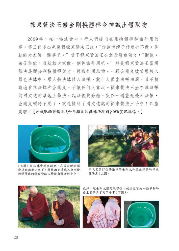《解脫大手印》—必須要看懂的前導文 擁有虛名的第四世祿東贊行人講述 我們請求師父為我們灌頂破阿法開頂插草或孔雀尾,讓神識出體自如,師父聽了當場哈哈大笑說:「愚氣未脫,破阿法確實能讓神識出體,但出體後就必須往升,神識一當出體後就收不回體內了,因為能收回神識這必須要有超越禪控的大法,既然你們為利眾生,我今傳你們勝於破阿法百千倍力之金剛換體禪吧!但要明白要修金剛換體禪就不能修現量大圓滿,開初也不可以再修拙火定和其他的任何法了,否則犯重法戒,兩者互礙,只不過這是當下就能給大家實際可見到的證量聖境功夫,也許對眾生更有利。其實拙火也可以當下兌現,實在要走這條路,我就為你和開初,還有一位妙空法師你認識嗎?」我說:「認識的。」佛陀師父說:「我給你們灌頂傳法吧!」就這樣接受佛陀師父灌頂,在一個時辰之內,讓我們二人分別進入金剛換體禪,頭頂開了二指寬,不但肉皮、肉層、骨蓋、腦膜、腦髓全打開了,神識出入無礙,而且遠程辦事,病障顯時,離體出修,把持安樂無礙,終於超越禪控。以前曾經所修的法拼了命想得到出神入化的,就是沒有,現在不想要,隨處超凡量境,神識空行無礙,這不是天地之差,這是聖凡之別啊!