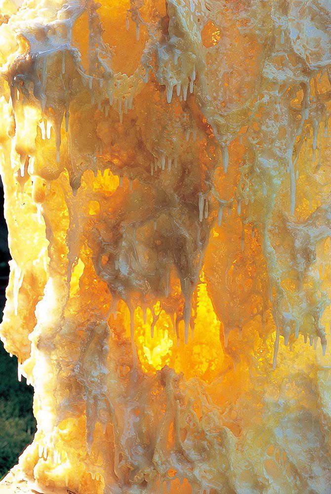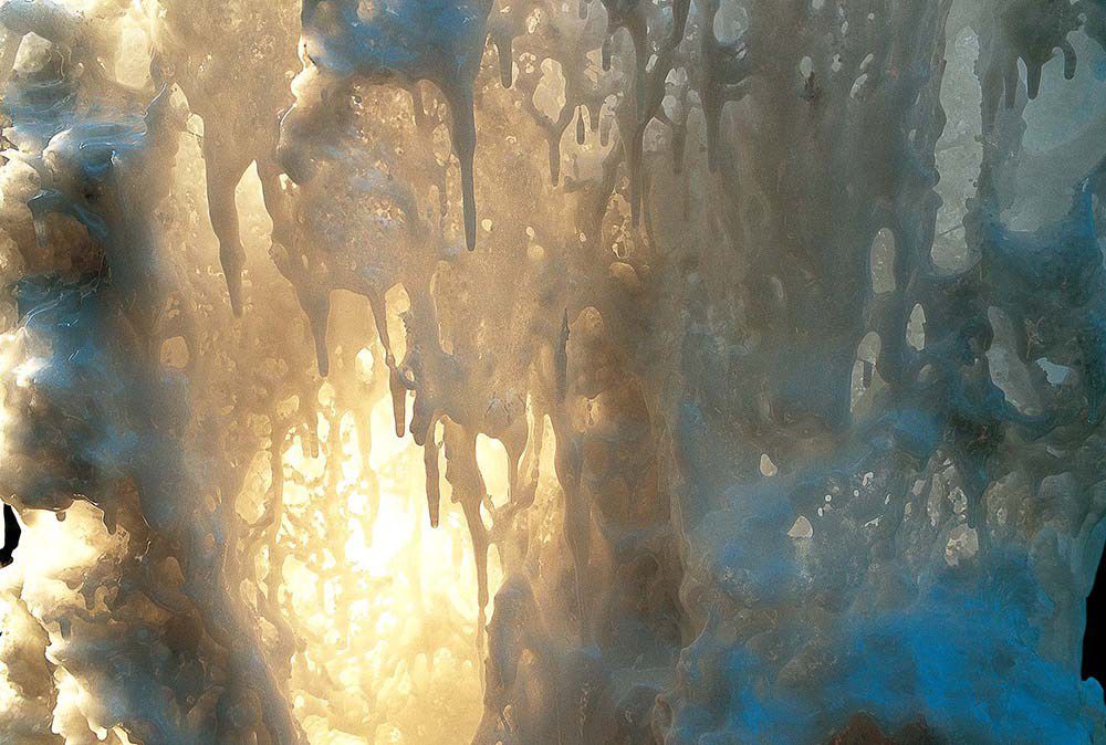 這個作品約有一丈高,大家打算將它抬上一個展示櫃的燈箱木底板,而這個底板的尺寸是為這個作品量身訂做的,當時安裝非常恰當,不大不小。這一次正當我們合力吆喝著將作品安放在底板上時,卻突然發現一件令人驚奇不堪、不可思議的事。作品的底部放在燈箱底板上發現全部變了,也就是說大了兩英吋了, 但是另外兩側又比燈箱底板小了很多,無論大家怎麼將作品旋轉, 調整來調整去,始終就是有兩側超出了底板,放不進去,最主要是它長大了,特別是上面長大太寬,無法罩上燈箱,也就是說, 作品根本就裝不進去燈箱。