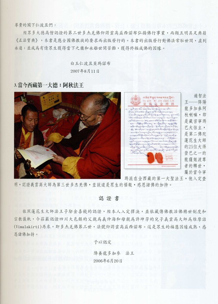 藏的第一大聖法王,他入定查明,認證義雲高大師為第三世多杰羌佛,並說這