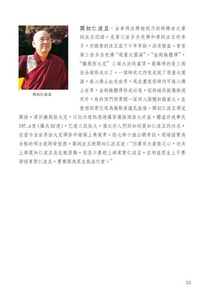 開初教尊在2010年當眾演示南無第三世多杰羌佛傳給他的“攤尸拙火定”內力,肚腹發出高溫達攝氏九十二度,煮熟了雞蛋。2020年2月9日在美國加州聖蹟寺,已經年屆88歲的開初教尊,體重一百八十多磅,三根手指頭有骨節折斷變形的舊傷,但教尊竟然用這隻殘缺的手,單手把一柄初級聖者杵,依法規拿上了基座,上超了十六段,展現了得道高人聖者的超凡體質體力。