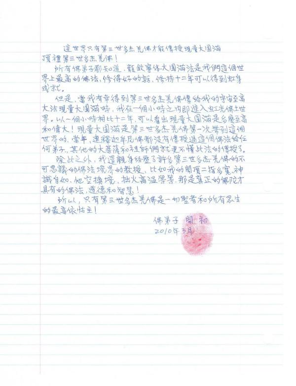 大成就者 開初教尊是一位非常忠心於南無第三世多杰羌佛如法清淨修持者,是摩訶法王認證的轉世仁波且,他是在一批受南無第三世多杰羌佛取髮灌頂的尊者和仁波且們中成就最快、證境最高的。他長期與摩訶法王住在一起,處處以佛事為第一,接受了明行、暗行諸多考驗,誠心無比,在摩訶老法王的聖因緣下功德成熟,終於接受了南無第三世多杰羌佛投花壇城聖義內密『現量大圓滿』灌頂,就在一小時內,成就了虹身法境,簡直是達到聞所未聞的快捷道量成就。