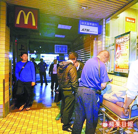 男子陳正邦昨在麥當勞廁所暴斃,葬儀社人員將遺體運往殯儀館。余思維攝