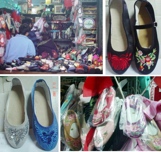 傳統繡花鞋一雙約250到300元,嬰兒虎頭鞋60元,繡花拖鞋150元,粗棉布鞋與功夫鞋約350元,老闆也努力求新求變,許多新潮設計也看得到,像仿麂皮的珠珠鞋,300元一雙。想要特殊花色也可以訂做,約一個禮拜到10天就可取貨。