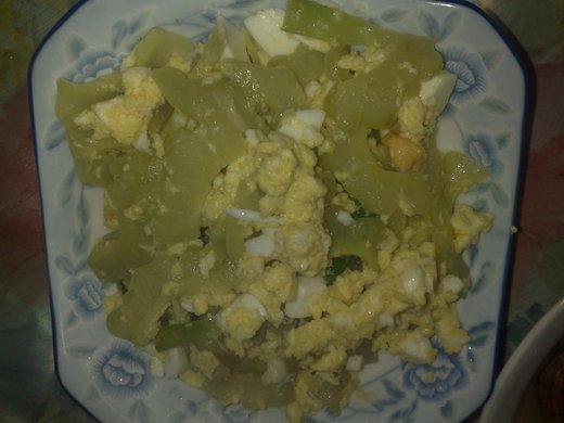 材料:苦瓜半條、鹹蛋一個、雞蛋一個、冰糖少許
