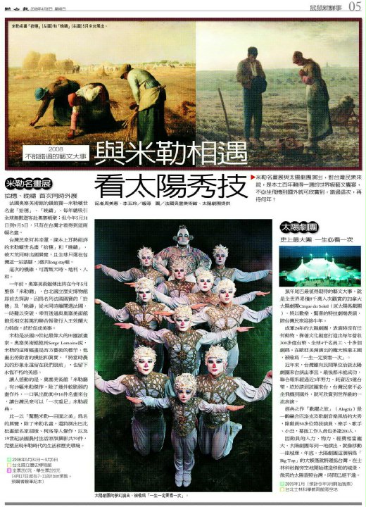 | 米勒名畫展與太陽劇團演出,對台灣民眾來說,是本土百年難得一遇的世界級藝文饗宴,不必坐飛機到國外就可欣賞到,錯過這次,再待何年? | |