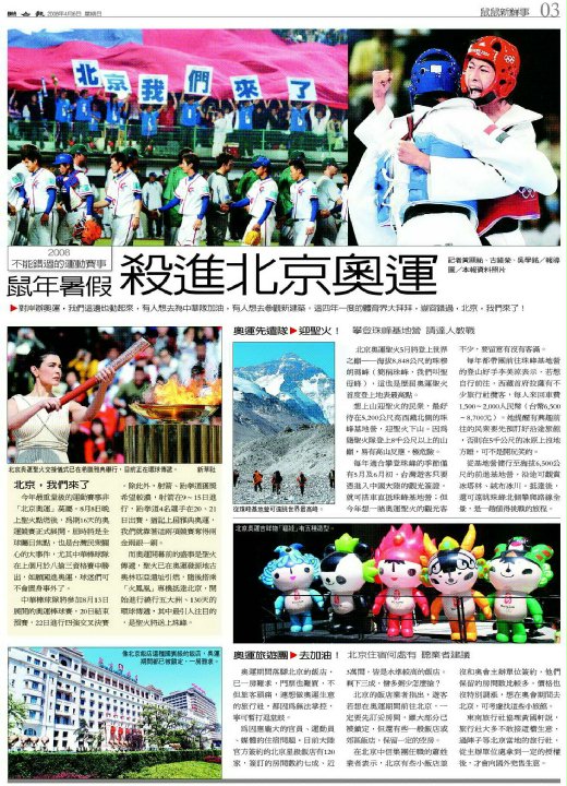 2008 不能錯過的運動賽事 鼠年暑假 殺進北京奧運 對岸辦奧運,我們這邊也動起來,有人想去為中華隊加油,有人想去參觀新建築。這四年一度的體育界大拜拜,豈容錯過,北京,我們來了! 記者黃顯祐、古鎮榮、...