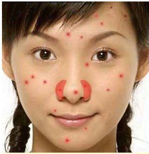 當鼻翼處長出痘痘 時,除了此處油脂分泌旺盛的原因外,還是胃火過大、消化不良的表現。如果鼻頭還有輕微脫皮現象,表明血液迴圈也不是很好。另外,經常便秘和胃脹氣的人也容 易長鼻痘。