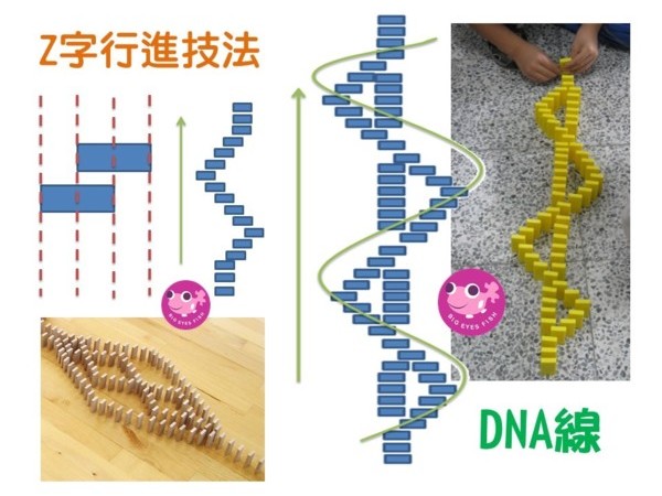通常我們排列一條骨牌直線時,就是一片一片的平行對齊接續排列,只是在做Z字行進時,必須邊排列直線邊將骨牌平行位移,但位移時必須讓前後片骨牌有重疊,如此一來骨牌雖然沒有旋轉,卻會出現類似彎曲弧線的圖樣。
