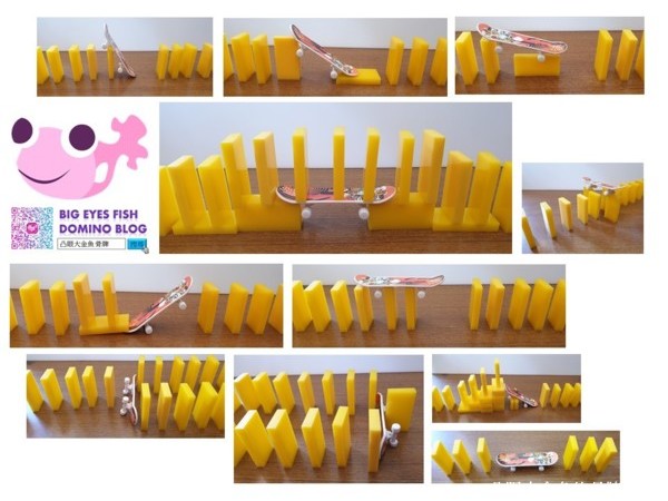 整體來說,玩具滑板撞擊骨牌倒下的撐功率算是高的,所以,基本上任意搭配都很容易成功,就是花樣不夠多的問題。