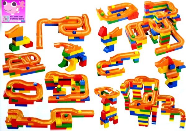 軌道組搭配骨牌的變化多樣,讓球滾軌道撞骨牌、骨牌撞球滾軌道、或兩者合一、軌道穿過骨牌陣、骨牌穿越軌道下方、骨牌飛越軌道上方、軌道繞骨牌、骨牌繞軌道、、、各種搭配真是千變萬化。