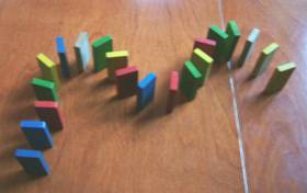 記得兩年前利用骨牌和教學結合,研究出了一個新的創意教學,原本只是一時興起的,因為覺得骨牌相當的好玩,而且也從來就沒有聽說過有人利用這種東西來教學,於是我在一次的夏令營活動中做了初次的嘗事。