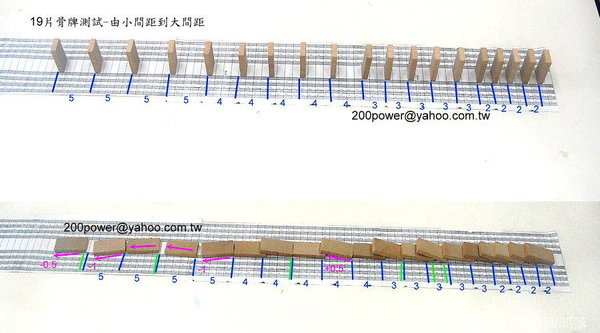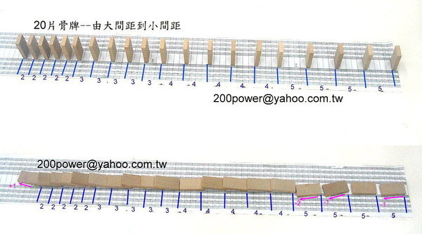 在此有一件事要特別說明的,雖然說是間距改變,但是,因為所使用的骨牌本身高度有限,間距只要超過骨牌的高度,幾乎就是無法推進了,說近,也只能隔2格(也就是中間空一格),說遠,也只能隔5格(也就是中間空5格),因此如果每次都增加一格,那麼只要6片骨牌就排完了,這樣實在看不出什麼明顯的效果,為了克服這個部份,我就增加了相同間距的骨牌片數,例如:間距2格的排5次,再排間距3格的5次,依此類推,這樣就可以增加骨牌列的長度,然後希望可以看出些比較明顯的差異。