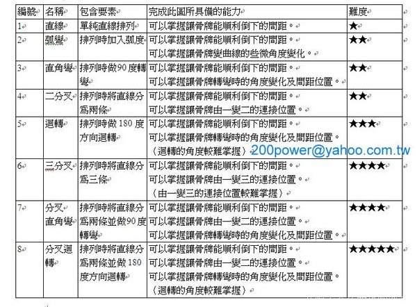 如果你認真的搜尋一下,你會發現,在文獻或網路上,有很多關於骨牌秀的資料,但卻沒有人在分析骨牌的排列技巧,因此,我總是針對這部分自己做分析,可是這樣一來又常會被人詬病說,自說自話。