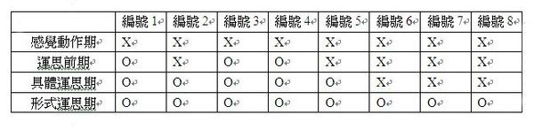 (1)「感覺/運動」階段:嬰兒沒有能力區分自己的身體和客觀環境,在這個階段,他的「圖式」是種沒有思想、沒有表象的工具,但他也有其「外延」和「內涵」,「外延」指的是圖式所適用的情境,「內涵」則是該圖式可運用情境的共同特性。