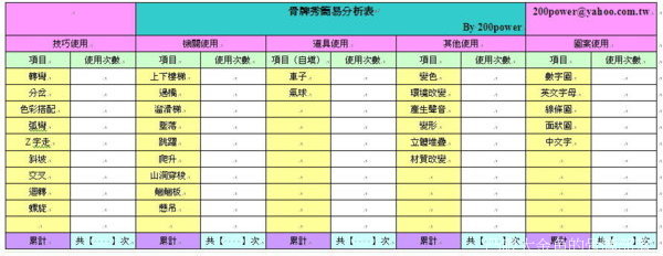 在介紹這張分析表的用法之前我要先說,這只是我個人的思考分析,我是這麼認為,這表格只是用來分析一場骨牌秀的特色,而不是來評斷好壞,我想要分好壞,應該是要有比較性的,要考慮的因素就變多了,而且,會有每個人的看法、欣賞角度的差異。