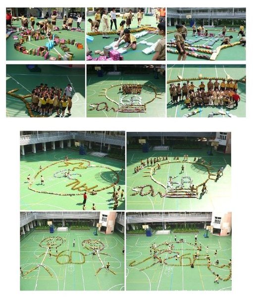 六年級的同學進行了月餅罐砌骨牌活動。同學們利用回收得來的月餅罐砌骨牌,各班的圖案都各具心意。在砌骨牌的過程中,大家也學會了合作精神的重要。