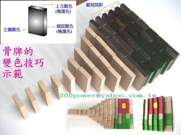 那麼這樣效果要怎麼做到呀?我們買得到骨牌明明就都只有一種顏色,怎麼做出這樣的效果呀?其實也有專門來做變色效果的骨牌,在本部落的「骨牌收藏」中,有一篇文章就是介紹這種雙色骨牌,可惜現在已經沒有人在賣了。不過,若真有人賣,就只為了變色而專門特製的骨牌想必也不便宜吧,相信對一般人而言,這一點都不划算。